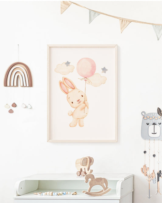 Poster per Bambini da Stampare – Coniglietto con Palloncino e Nuvole (Stampa Digitale)