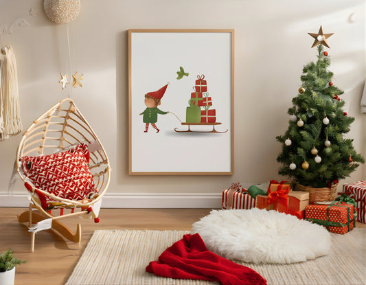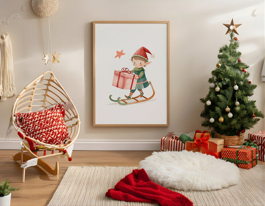 Poster per bambini da stampare con Elfo sulla Slitta (Stampa Digitale)
